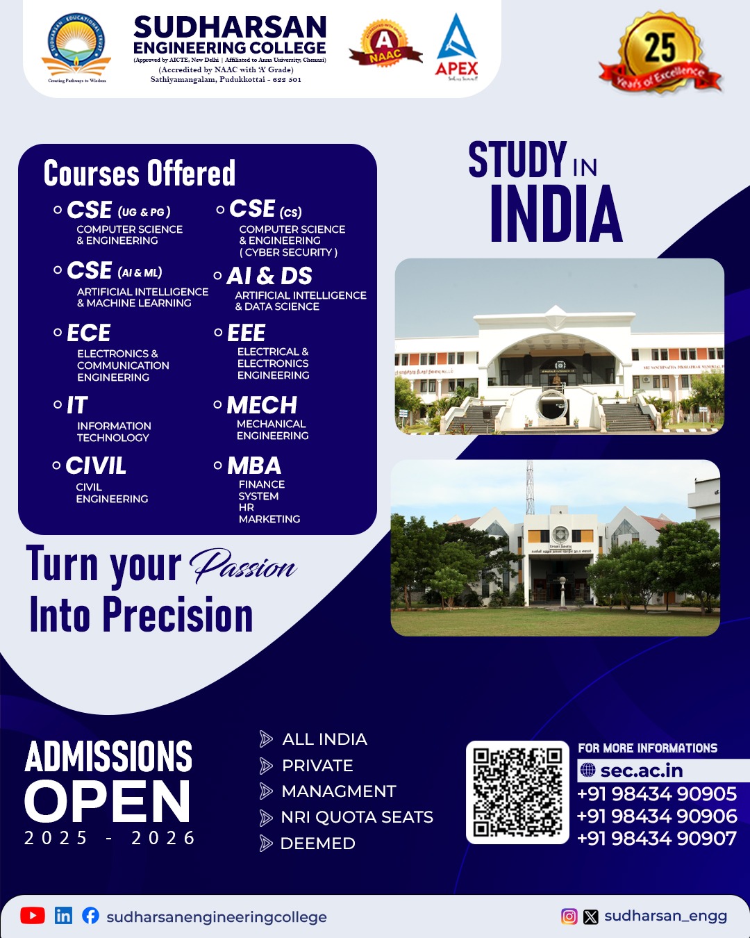 Sudharsan Engineering College (SEC) offers Nine undergraduate programmes across diverse engineering and technology disciplines, including Civil Engineering, Mechanical Engineering, Electrical and Electronics Engineering, Electronics and Communication Engineering, Computer Science and Engineering, Artificial Intelligence and Data Science, Artificial Intelligence and Machine Learning, Information Technology, and Cyber Security.