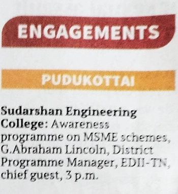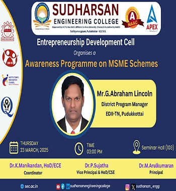 The Entrepreneurship Development Cell (EDC) at Sudharsan Engineering College is established to foster the spirit of innovation and entrepreneurship among students. It serves as a platform to nurture entrepreneurial potential and transform innovative ideas into successful ventures. EDC aims to inspire students to become future-ready entrepreneurs, startup founders, and business leaders by providing the right guidance, mentorship, and resources.